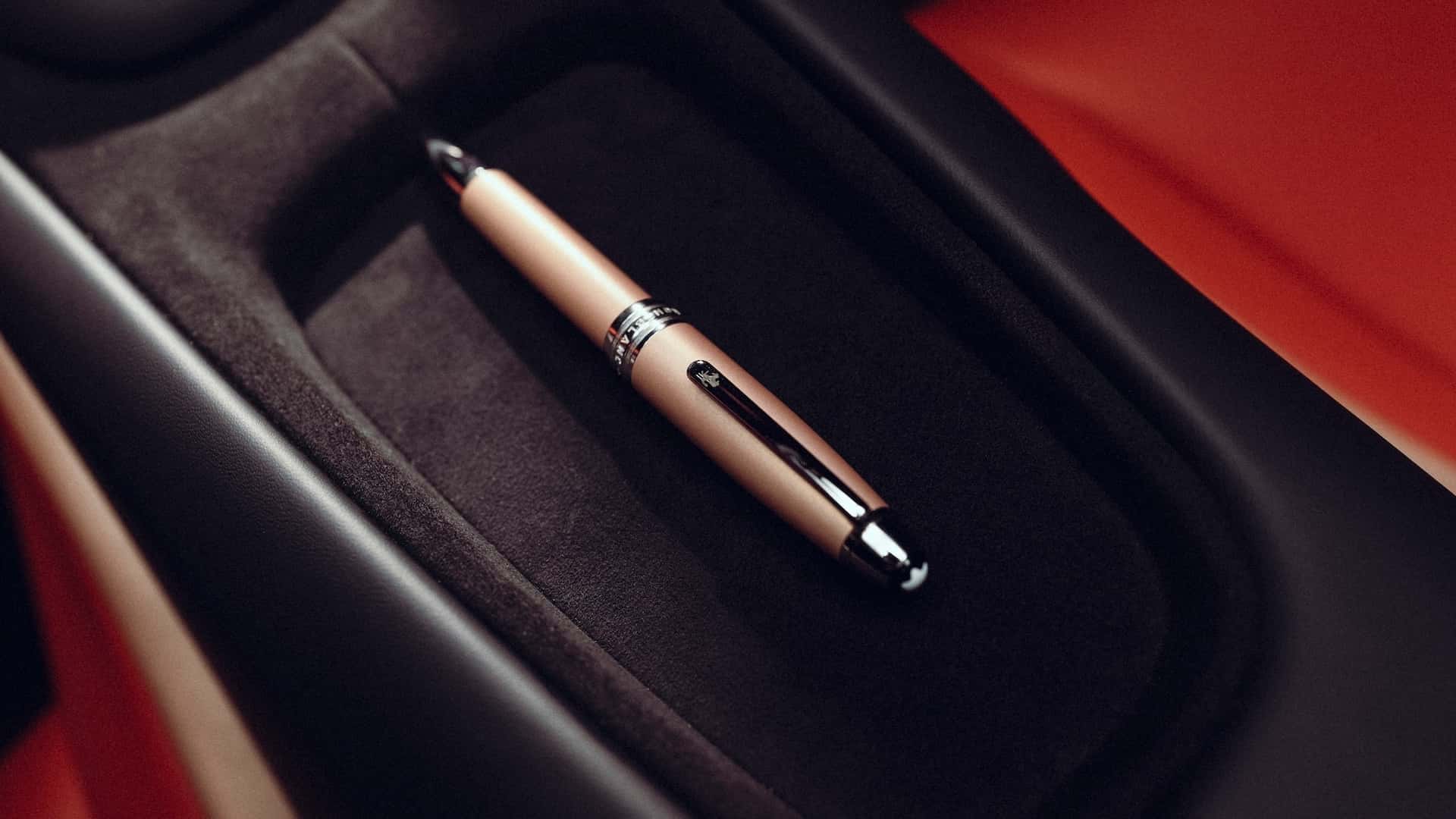 ترتدي السيارة طلاء Oro Mida الجميل الذي لن تجده في العديد من سيارات فيراري الحديثة، وتأتي مع قلم Meisterstück مطابق بنفس اللون. يتميز القلم الفريد من نوعه بلمسات ذهبية صلبة Au750 مصنوعة يدويًا ومطلية بالبلاتين، وزخرفة تصميم مخصصة تتطابق مع تلك الموجودة على غطاء محرك سيارة روما.