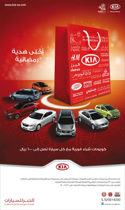 عند شراءك اي من سيارات كيا من الجبر للسيارات يمكنك الحصول على مجموعة من القسائم الشرائية التي تبلغ قيمتها حتى 6000 ريال سعودي و التي تخولك الشراء من 480 فرع للماركات العالمية التابعة لشركة الشايع الدولبة للتجارة ( للتعرف على هذه الماركات و مواقعها يمكنك الاتصال على 920002482 )
