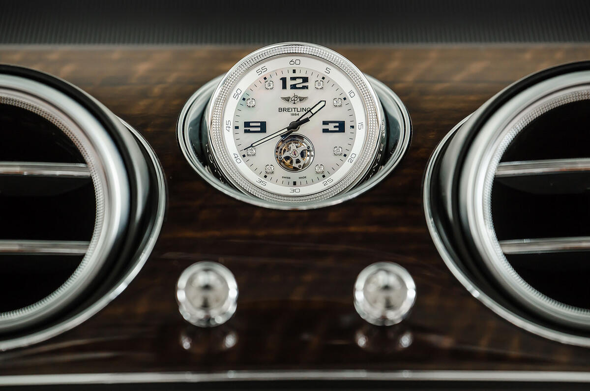 A bespoke mechanical Mulliner Tourbillon by Breitling clock can also be specified. The most complex of watch mechanisms, the Mulliner Tourbillon is automatically wound periodically by a dedicated high-precision winding mechanism within the car. This masterpiece is machined in solid gold (customers can select from either rose or white gold), with a choice of either a mother-of-pearl or black ebony face and decorated with eight diamond indexes.