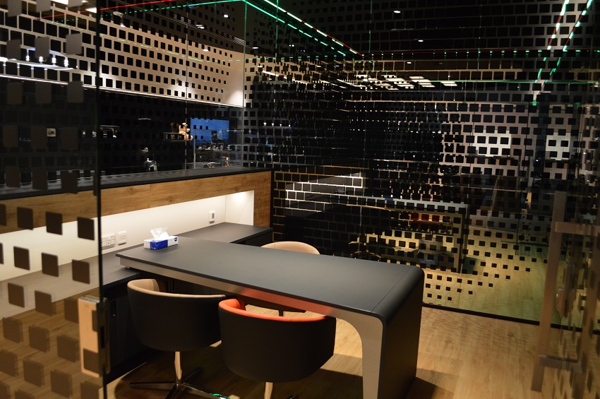 كل غرفة من هذه الغرف الخاصة مزودة بشاشة عرض كبيرة مدمجة بالحائط تعرض للعميل التعديلات التي يرغب بها