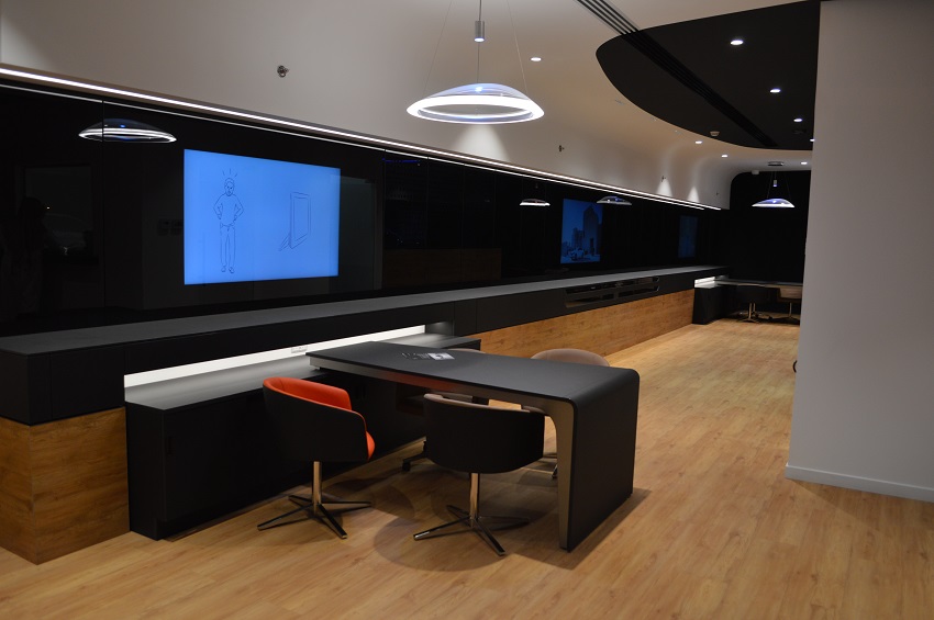 طبعا من الوهلة الاولى عند دخول الصالة يستشعر الزائر الاحساس بشعور ينقله الى عالم ملئ بالتكنلوجيا والتقنية