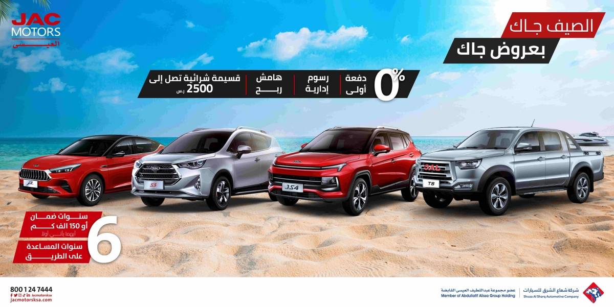 حيث يتضمن عرض الصيف من جاك العيسى مجموعة متنوعة من الخيارات والمزايا وخطط الدفع المرنة لعملاء الشراء النقدي، وعملاء شراء التمويل بالتعاون مع العديد من الجهات التمويلية، يتيح للعميل فرصة الحصول على أي من طرازات JAC، تشمل الطراز السيدان الرياضي عالِ الأداء J7، الكروس أوفر المدمج بشاحن توربيني JS4، الطراز الرياضي S3 متعدد الاستخدامات و طراز البيك أب T8 متوسط الحجم. حيث تتوفر العروض بدون دفعة أولى وبدون رسوم إدارية، بالإضافة الى حصول العميل على قسيمة شراء مجانية تصل قيمتها إلى 2,500 ريال سعودي. فيما يتمتع عملاء سيارات JAC دوماً بضمان المصنع الاستثنائي لمدة 6 سنوات أو 150,000 كلم، و 6 سنوات خدمة المساعدة على الطريق.